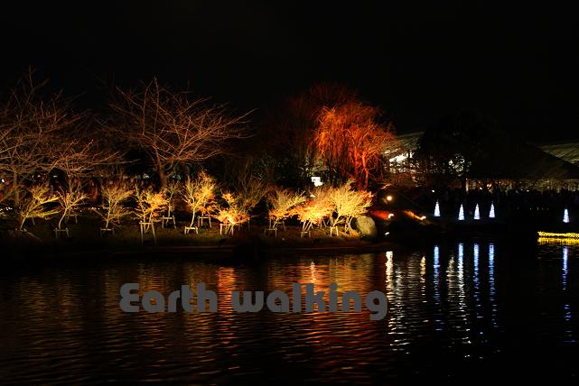洋風なイルミネーションもあれば、和を感じるイルミネーションがあるのもここの面白いところです。水面に鏡のように映し出された木々がこれまた趣深いです。