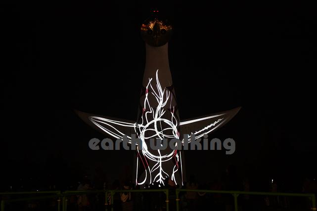 万博公園の太陽の塔がライトアップされているとのことなので、行ってきました。ただのライトアップではなくて、岡本太郎の作品からヒントを得て制作した映像等を『ビームペインティング』という方法で太陽の塔に照射するという手法です。