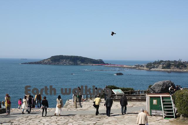 そのまままっすぐに進むと、東尋坊に到着。遠くには赤い橋の架かった雄島が望めます。昔から神の島と呼ばれているそうです。