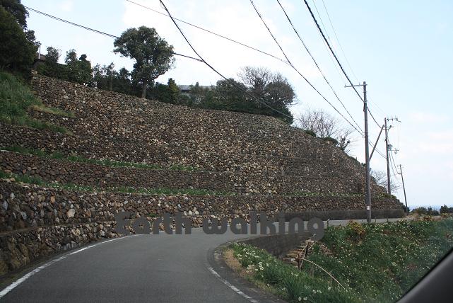 そのまま進むと再び海岸沿いに。今回は結構高いところを走っていて、脱輪すると海に転げ落ちそうですね。石をきれいに敷き詰めた壁もありました。なんだか南国風ですね。