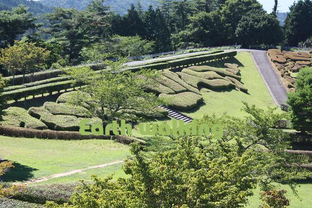 ちょっくら建物前の小高い展望台(?)に登ってみると、広大な芝生が広がっていました。植木が面白い形に切りそろえられていますが、何をデザインしているんでしょ??