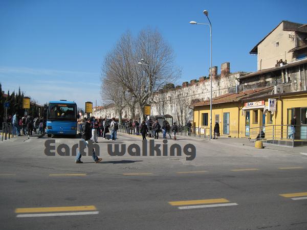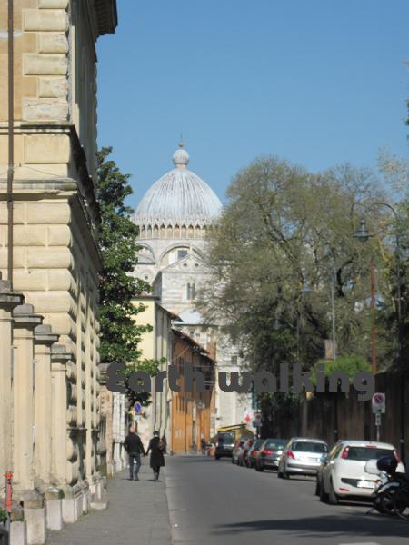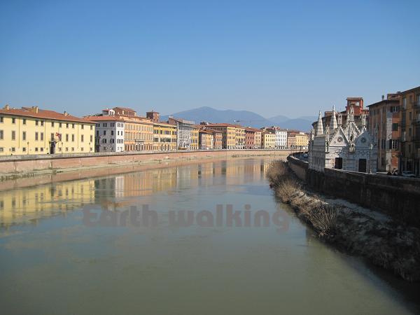 この案内図からも分かる通り、街の中心部は要塞の用になっており塀で囲まれています。かつては結構栄えていた都市だったようです。この図によると76番が駅なので、ここからずっとまっすぐ進んで川を渡った後に適当に左方向に行けばピサの斜塔(Torre di Pisa)に着けそうです。約1.5kmぐらいあるみたい。