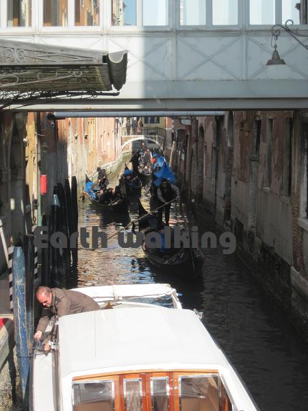 しばらく行くと、船で乗り付けて入場するホテルを発見。宿泊客も荷物もすべて船で到着していました。この街ならではですね。向こうには観光客が乗ったゴンドラがたくさん。こんな窮屈なせまい運河でもうまいことすれ違って行き来していました。