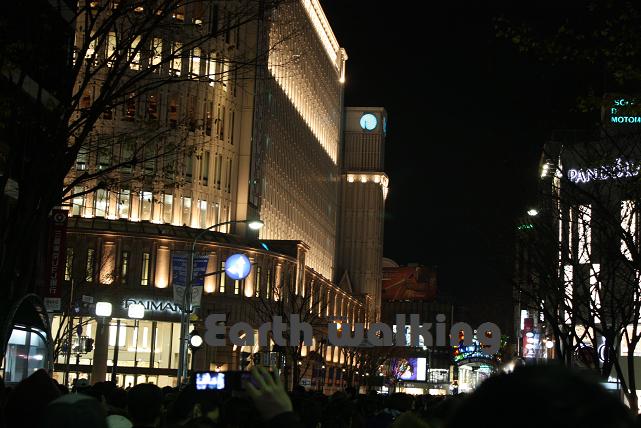 先ほどの大丸の反対側(東側)の通りです。この先の角を曲がればいよいよルミナリエ。すぐそこに会場があるのに、交通規制のため、ここまで来るのに30分以上かかりました・・・。ちょっと時間が遅くなるだけで、混み方がハンパないですね。