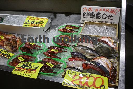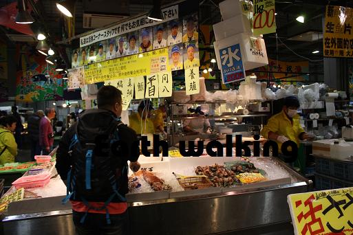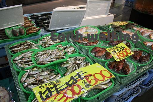 中は大きな海鮮市場になっていて、野菜から肉、魚、果物、乾物などさまざまな食材がそろっています。試食もいっぱい♪地元のミカンなどもいっぱい食べれました♪