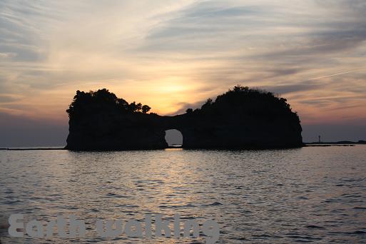 で、到着した「円月島」。すっかりいい具合の夕焼けになっています。円月島の正面の浅瀬には円月島の空洞に落ちる夕陽をみようと多くの人が集まっています。