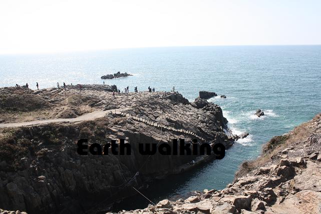 そのまままっすぐに進むと、東尋坊に到着。遠くには赤い橋の架かった雄島が望めます。昔から神の島と呼ばれているそうです。