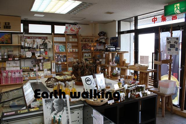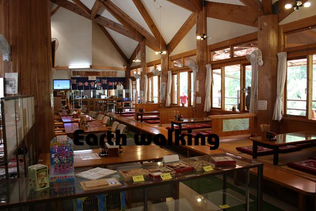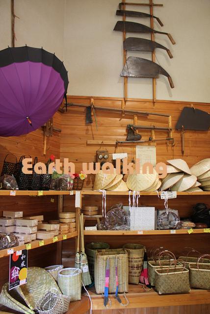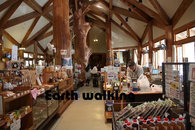 建物は広大なワンフロアで、中央を境にお食事処と物産館とに分かれています。物産館には土産物菓子や特産品がいっぱい。建物のインテリアからもわかる通り、ここも山での生活に密着した商品がたくさん売られています。