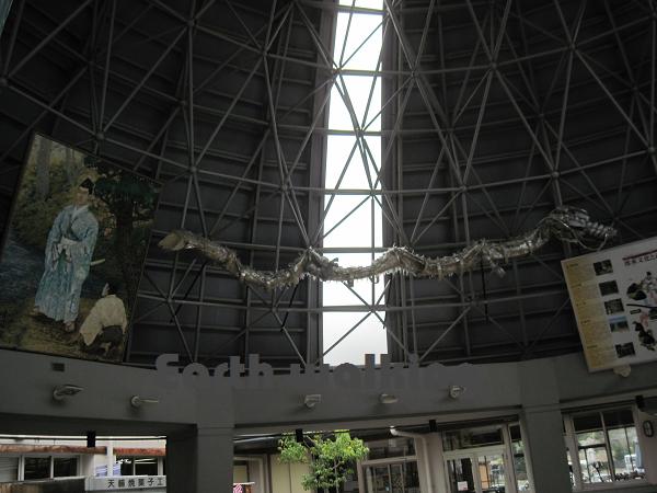 ここは源義経が元服した場所として有名なようです。源義経よりも牛若丸のほうがピンとくるかもしれませんね。建物入口前のドーム部分には義経と思われる絵と竜が展示されていました。