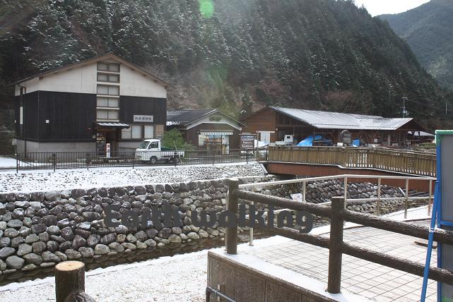 そんなこんなで道の駅『R427かみ』に到着。ここに来るまでには、ひと山越えるのですが、山を超えると路肩には雪が結構残っていました。道の駅の川向こうに見える杉原紙の資料館周囲は雪で真白になっていました。