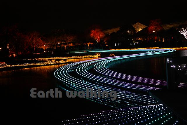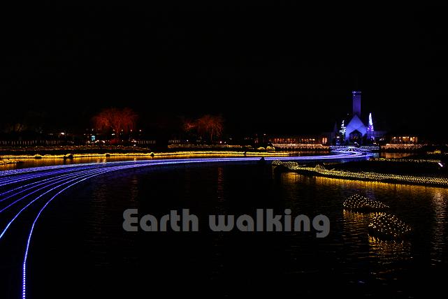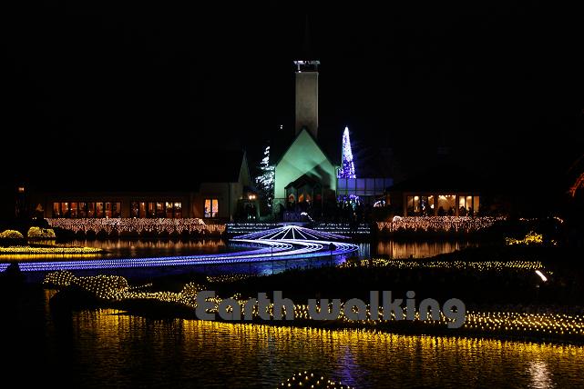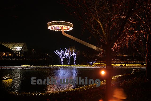 池のところまで戻って来ると、こちら側もイルミネーションでライトアップされていました。てっきりさっきのトンネルや光の原っぱだけかと思ったら、なばなの里全体がきれいにライトアップされているんですね。