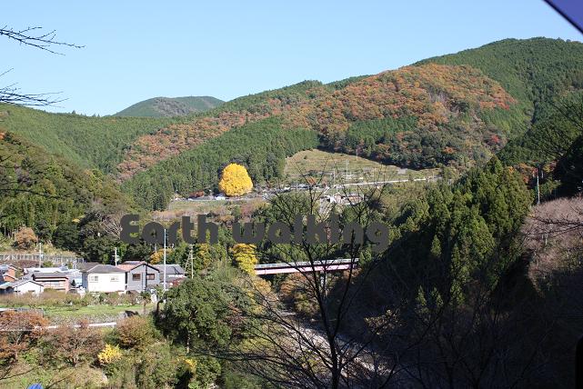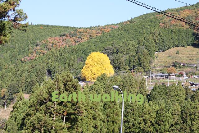 しばらく進むと、遠くの山に黄色いスポットが見えてきました。紅葉の混じった緑の山に黄色が一点。
