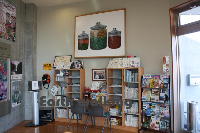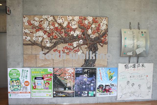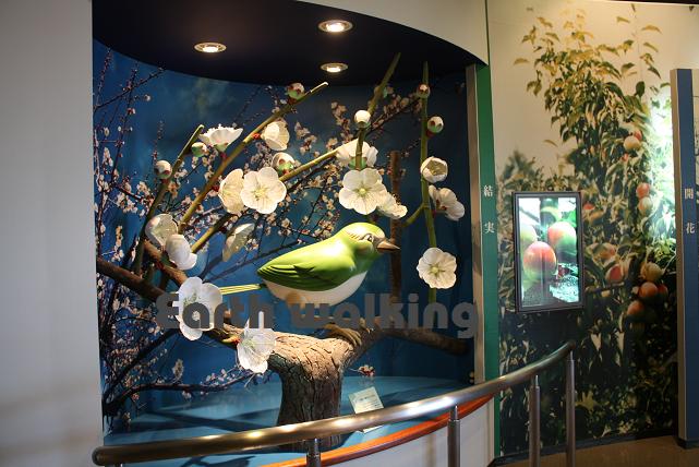 向かいの休憩スペースにもリアルな梅の絵が展示されています。その隣からは駐車場へ出ることができます。受付お姉さんのいるカウンターがあることなどを考えると、こっちがメインの入口かな??
