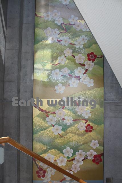 今度は階段を下って下の階に行ってみることに。コンクリートむき出しの壁には梅をモチーフにした立派な作品が飾られています。