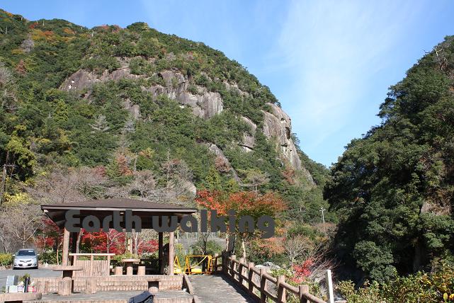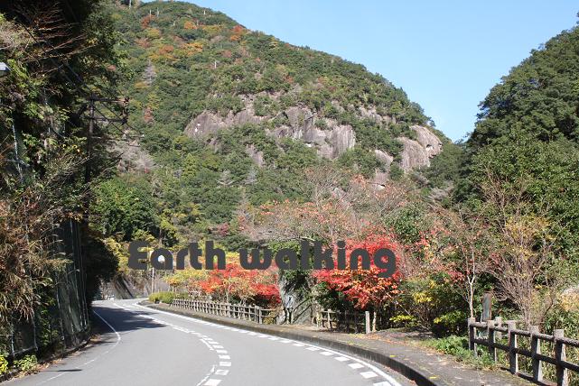車を走らせていると、岩壁が見えてきます。ちょっと進んだところにある駐車スペースのところに車を停めて、少し散策してみることに。走ってきた方向を振り返ると、先ほどの岩壁と紅葉の迫力ある風景を楽しめます。