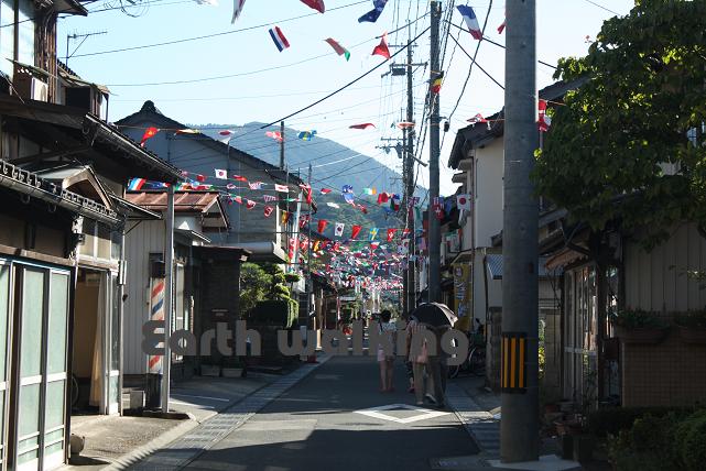 次の目的地は道の駅『但馬のまほろば』。カーナビの指示に従って車を走らせていくと、ものすごい田舎の住宅地って感じの路地に入ってきました。しかもその日はお祭りの日だったみたいで地域の住民たちで道は大混雑。道には各国の国旗がなびいていました。