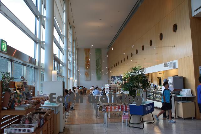 建物の2階からは高速道路の反対車線へとつながる渡り廊下へ行くことができます。2階から建物内を見降ろすと、ほんと広々していますね。