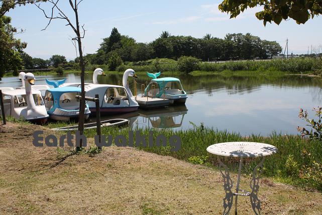 今度は池(沼?)の周りをあるいて反対側に行ってみることに。池にはスワンボートがあります。カップルや親子連れで楽しめそうですね。橋を渡って反対側へ行くと・・・・。