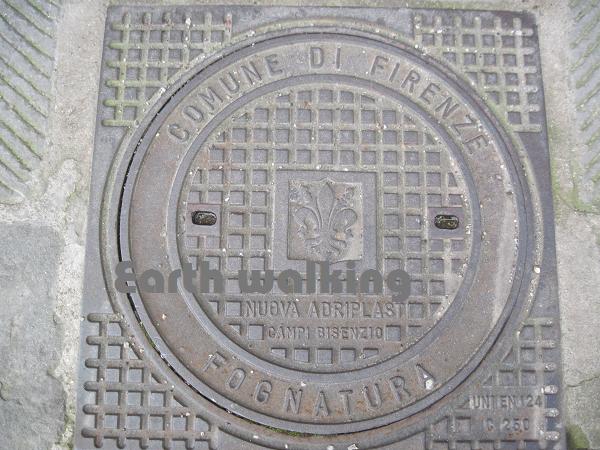橋を渡ってからは南東の方角へ路地を進みます。よくみると町のマンホールにもフィレンツェの紋章が。この紋章かっこいいですねー。ドラゴンアッシュもここからアイデアをとったんでしょうねぇ。