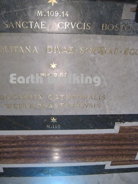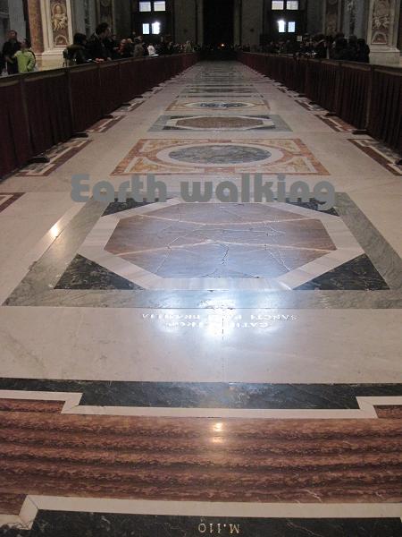 よくみると床に文字が打ち込まれています。キリスト教の聖堂のを大きさごとに並べて記載されているようです。たぶん。ちなみにサン・ピエトロ大聖堂(St. Peter's Basilica)はキリスト教では最大の大聖堂なんだそうです。
