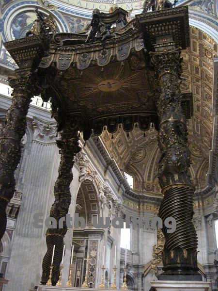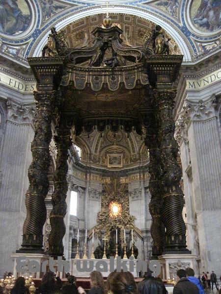バルダッキーノの大天蓋(Bernini's baldacchino)は近くで見ると少し不気味で高貴な雰囲気がムンムン。きれいならせん状を表現した石柱と屋根のデザインが圧倒的。教皇のみがここで祭典を挙行するようです。