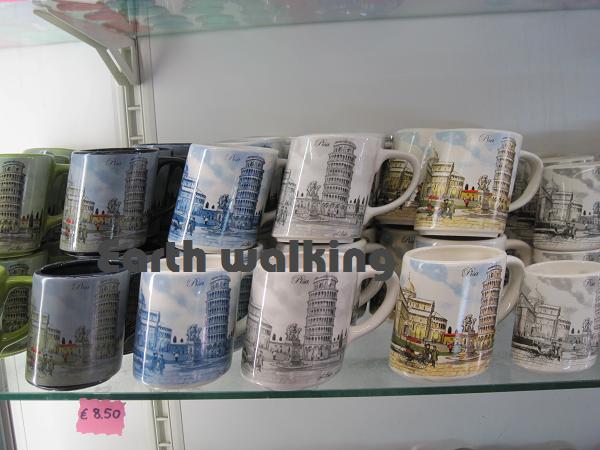 となりのお土産物屋を覗くと、お土産物屋の定番のマグカップまで傾いていました(笑
