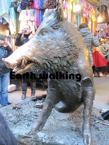 マーケットみたいな広場のそばには謎のイノシシのブロンズ像がありました。なぜかみんなお賽銭を投げこんで鼻をさするので、イノシシの鼻だけ黄金色になっています。(後でネットで調べたらイノシシの口からコインを落として足元の穴にうまく入れば願い事がかなうようです。)