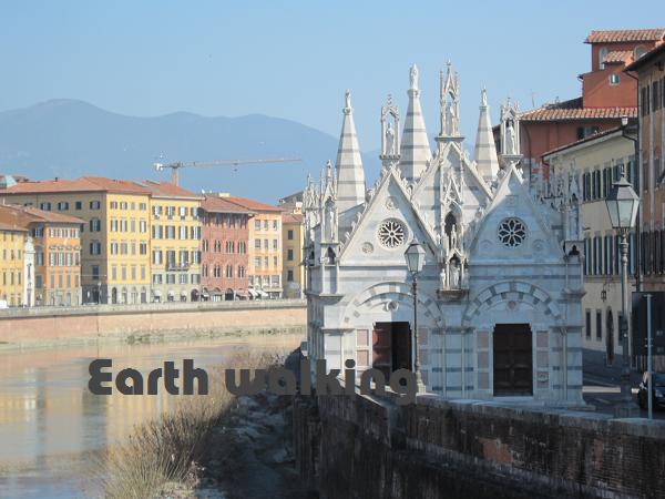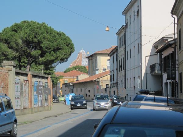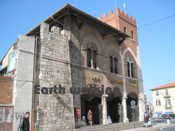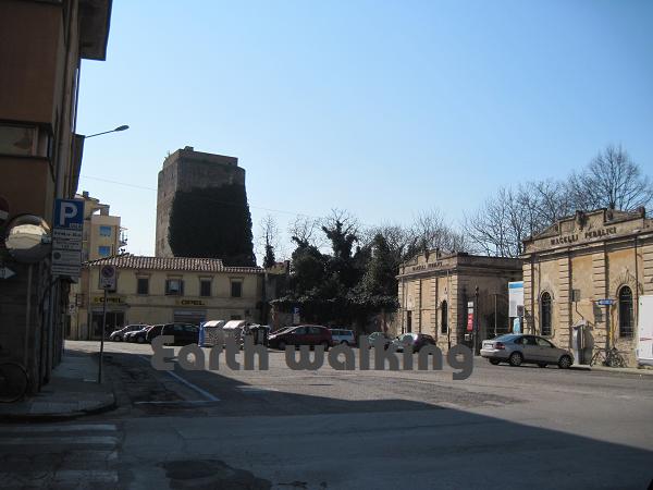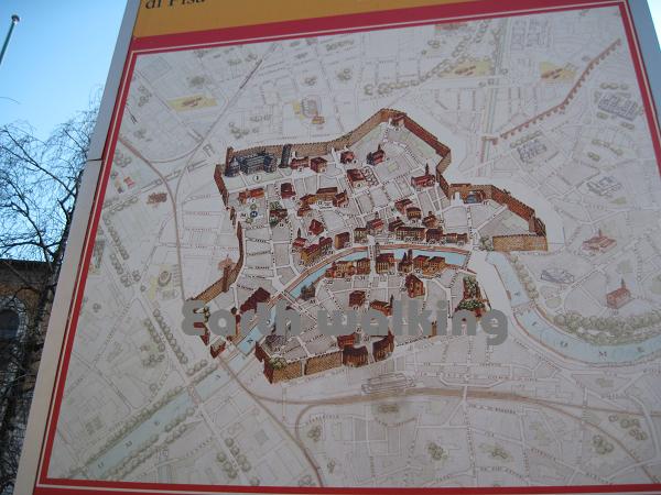 この案内図からも分かる通り、街の中心部は要塞の用になっており塀で囲まれています。かつては結構栄えていた都市だったようです。この図によると76番が駅なので、ここからずっとまっすぐ進んで川を渡った後に適当に左方向に行けばピサの斜塔(Torre di Pisa)に着けそうです。約1.5kmぐらいあるみたい。
