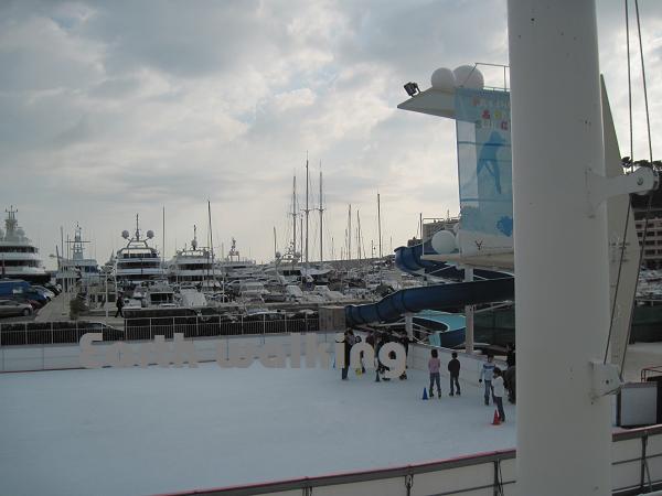そのまま海辺に行くと人工のスケートリンクがあって、ちびっこスケート教室みたいなのが開催されていました。バックには豪華なクルーザーがいっぱい。。。