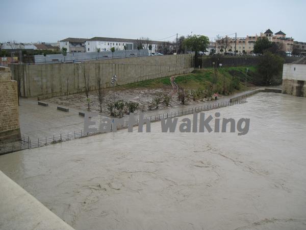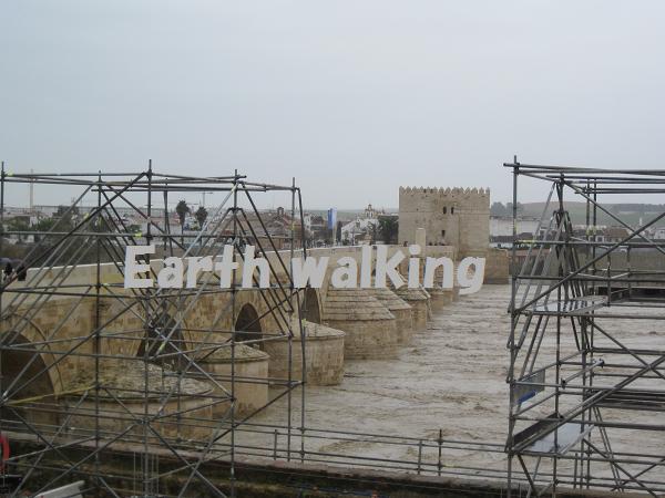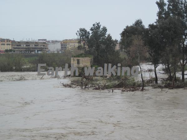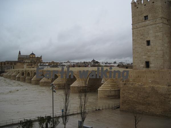 まずはグアダルキビール川(Guadalquivir)にかかるローマ橋へ。この時には雨はやんでたけど、その前に降った大雨のせいで川は大反乱。ほんとうなら川中の浅瀬に静かにたたずむ廃墟も、この日は大雨で川上から流されてきましたみたいな絵になってました。